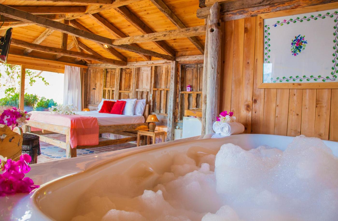 Exclusive Suite With Jacuzzi. Located on the top floor, it has picturesque views of the Mediterranean Sea. Includes a spa bath. These two rooms are 45 sqm each and boast breathtaking views of the sea from Fidanka’s highest point. Boasting double windows and built with centuries old cedar timbers from nearby villages, guests are sure to be amazed at the Mediterranean’s blue and Kalkan’s lights from these rooms’ hot tubs and terraces. Both rooms have private entrances, extensive sea and pool views, and a private seating area. ;
